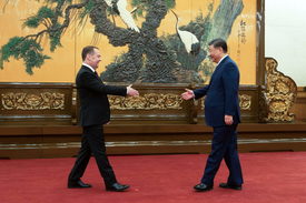 Hszi Csin-ping kínai elnök Dmitrij Medvegyevet, az orosz biztonsági tanács elnökhelyettesét fogadja Pekingben 2024. december 12-én