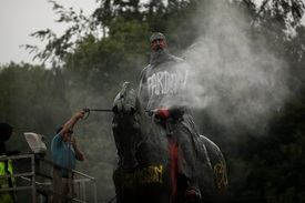 A Le Soir című belga napilap arról számolt be pénteken, hogy álarcot viselő ismeretlen elkövetők a belga gyarmati múltra utaló utcanévtáblákat mázoltak össze a fővárosban. Brüsszel egyik elővárosában, Auderghemben ledöntötték II. Lipót szobrát, valamint vörös festékkel öntötték le az 1993-ig uralkodott I. Baldvin király mellszobrát Brüsszel belvárosában, a Szent Mihály és Szent Gudula-székesegyház előtti parkban.