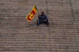 Srí Lanka zászlajával a kezében ül egy kormányellenes tüntető az elnöki titkárság lépcsőjén Colombóban 2022. július 21-én, amikor az ügyvivő államfői posztot is betöltő Ranil Vikremeszinghe miniszterelnök letette hivatali esküjét államfőként. MTI/AP/Rafik Makbúl