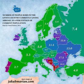 A legsúlyosabb a helyzet Bosznia-Hercegovinában (a lakosság 43,3 százaléka él külföldön), Albánia lakosságának 38,8 százaléka keresi idegenben a boldogulást, Macedónia népességének 24,8 százaléka hagyta el szülőföldjét. Ugyancsak jelentős az elvándorlás Portugáliában (22,3 százalék), Horvátországban (20,4 százalék), de a balti államokban is jelentős ez a ráta (Litvániában 18,9 százalék, Lettországban 17,1 százalék, Észtországban 15,1 százalék.)