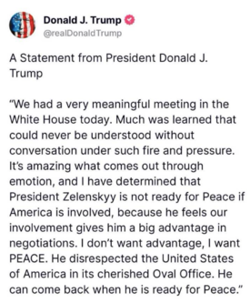 „Megállapítottam, hogy Zelenszkij elnök nem áll készen a békére abban az esetben, ha Amerika is részt vesz [a tárgyalásokon], mert úgy érzi, a mi szerepvállalásunk komoly előnyhöz juttatja őt” – írta az amerikai elnök pénteken a közösségi oldalán. – „Én nem előnyt akarok; én BÉKÉT akarok. [Zelenszkij] tiszteletlenül viselkedett az Egyesült Államokkal szemben a nagy múltú Ovális Irodában. Visszatérhet majd akkor, amikor készen áll a BÉKÉRE”.