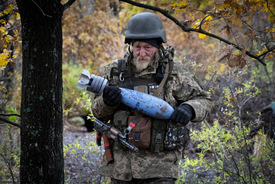 Ukrán tüzér aknagránátot visz, miközben egysége aknavetővel az orosz állásokat lövi a kelet-ukrajnai Donyecki területen fekvő Bahmut környékén
