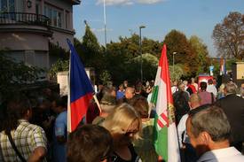 Orbán értünk, mi Orbánért jelszó alatt tüntettek néhány százan csütörtök este Prágában, a magyar nagykövetség épülete előtt.Orbán értünk, mi Orbánért jelszó alatt tüntettek néhány százan csütörtök este Prágában, a magyar nagykövetség épülete előtt.