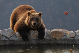 Almát dobnak egy fogságból kiszabadított barnamedvének a koszovói Mramor falu közelében lévő medverezervátumban 2021. december 22-én. A vadon született kölyökmedvéket állatkereskedők ragadták el anyjuktól és éttermeknek adták el őket, hogy mutatványokat taníthassanak be nekik, vagy leitathassák őket a vendégek szórakoztatására