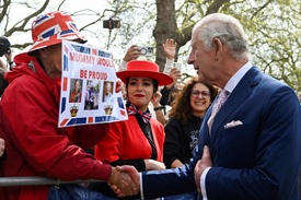 III. Károly brit király beszélget az emberekkel, miközben megnézi az ünnepi előkészületeket a londoni Buckingham-palota előtt 2023. május 5-én