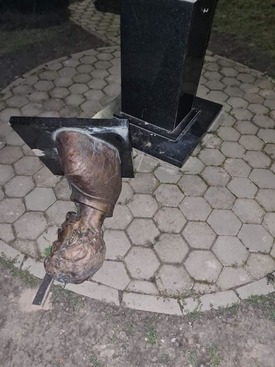 „Az így is gyenge lábakon álló haraszti magyar identitás most a földön hever” – fogalmazott, utalva arra, hogy a szobor a talpazatról ledöntve, arccal a földre dőlt.