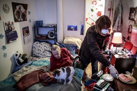 Kesztyűt és védőmaszkot viselő francia ápolónő a 86 éves páciensével Párizsban 2020. március 17-én.