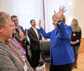 Angela Merkel német kancellár szír bevándorlókat látogat meg, akik a német alkotmányról tanulnak (Fotó: MTI)