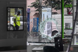 Tüntetők által bezúzott kirakatüvegnél áll egy férfi Párizs közelében lévő Montreuil-ben 2023. július 1-jén