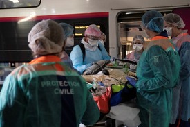 A járványügyi szakember arra hívta fel a figyelmet, hogy a járvány előtt ötezer intenzív ágy állt rendelkezésre, és a francia egészségügy fokozatosan bővíti a kapacitását az újabb betegek elhelyezésére, és folyamatosan evakuálja a súlyos, de stabil állapotban lévő betegeket a túlterhelt kórházakból az ország olyan részeibe, ahol kevésbé terjed a járvány. Két mentővonattá alakított szuperexpresszel (TGV-vel) szerdán 36 beteget szállítottak el Párizsból Bretagne kórházaiba, és csütörtökön is folytatódnak az evakuálások a leterhelt fővárosi kórházakból.