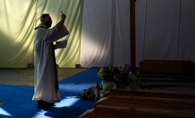 Az új koronavírus okozta betegségben meghalt emberek koporsóit áldja meg egy védőmaszkos katolikus pap, mielőtt a koporsókat a különböző olaszországi térségekben működő krematóriumokba szállítják a lombardiai Bergamo közelében fekvő Ponte San Pietróból 2020. április 3-án. Bergamo a vírussal egyik leginkább sújtott város Lombardiában, a járvány olaszországi gócpontjában.
