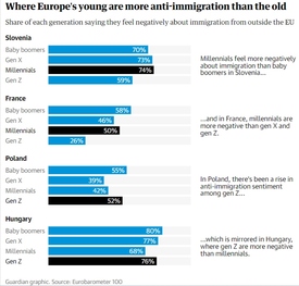 Európa egyes részein a fiatalok bevándorlásellenesebbek, mint az idősebb generációk – ez derül ki a The Guardian elemzéséből, mely egy, az egész Európai Unióra kiterjedő közvélemény-kutatást ismertet. A lap szerint ez a tendencia a bevándorlásellenes jobboldali pártoknak kedvezhetA Mandiner az elemzés részleteit ismertetve azt írja, Európa-szerte még mindig a baby boomer (59–77 évesek) a leginkább bevándorlásellenes véleményeket valló generáció, de egyes tagállamokban az ezredfordulósok, azaz az 1980 és 1997 között születettek, illetve a Z generáció (1997 után születettek) is ugyanilyen negatívan, vagy még negatívabban viszonyulnak az Európán kívülről érkező bevándorláshoz.