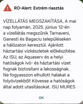 „VÍZELLÁTÁS MEGSZAKÍTÁSA. A mai nap folyamán, 2025. június 12-én a vízellátás megszűnik Dicsőszentmárton, Vámosgálfalva és Bogács településeken a hálózaton keresztül. Ajánlott háztartási vízkészletek előkészítése. Az ISU (Katasztrófaelleni Hatóság), az Aquaserv és a helyi hatóságok ivó-és háztartási vizet fognak biztosítani a lakosságnak. Ne fogyasszon elhullott halakat a folyóvizekből! Kövesse a hatóságok által adott utasításokat. ISU MAROS”