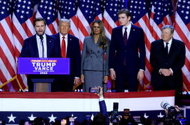 J. D. Vance ohiói szenátor, republikánus alelnökjelölt beszél Donald Trump republikánus elnökjelölt (b2), a felesége, Melania Trump és a fiuk, Barron Trump (j2) mellett az amerikai elnökválasztás és kongresszusi választások utáni eredményvárón, ahol bejelentik gyõzelmüket a floridai West Palm Beachben 2024. november 6-án hajnalban.