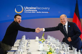 Olaf Scholz német kancellár (j) és Volodimir Zelenszkij ukrán elnök kezet fog a kétnapos ukrajnai újjáépítési konferencia elsõ napi tanácskozása keretében tartott kétoldalú megbeszélésükön Berlinben 2024. június 11-én.