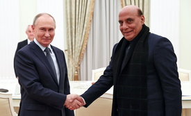 Vlagyimir Putyin orosz elnök (b) fogadja Radzsnath Szingh indiai védelmi minisztert
