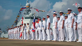 Orosz haditengerészek a kínai haditengerészekkel közös hadgyakorlatuk előtti fogadási ünnepségen a Kuangtung (Kanton) tartománybeli Csancsiang támaszpontján