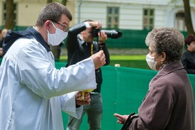Áldoztatás a szentmisén a csíksomlyói kegytemplom udvarán a csíksomlyói búcsún 2020. május 30-án.