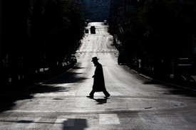 A koronavírus-járvány ellen elrendelt intézkedések miatt néptelen utcán kel át egy ultraortodox zsidó férfi az izraeli Bné-Berakban a pészah ünnep kezdetének napján, 2020. április 8-án.