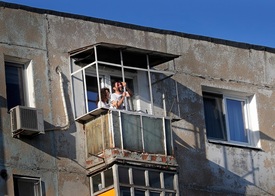 Bukaresti lakásának balkonján egy pár 2020. április 6-án. A koronavírus-járvány miatt bevezetett rendkívüli állapotot egy hónappal meghosszabbítják Romániában