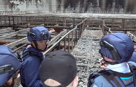 Az orosz védelmi minisztérium sajtószolgálatának videófelvételről készített képén Rafael Grossi, a Nemzetközi Atomenergia-ügynökség (NAÜ) fõigazgatója nézi az okozott kárt az orosz megszállás alatt álló zaporizzsjai atomerőmű egyik hûtõtornyában a délkelet-ukrajnai Enerhodarban 2024. szeptember 4-én