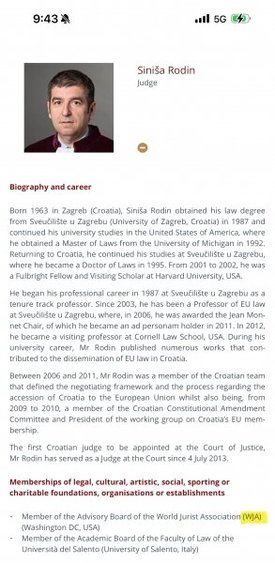 Egy további bíró, Siniša Rodin annak a World Jourist Association nevű szervezetnek az egyik főtanácsadója, amely Soros György szervezeteivel, így a Human Rights Watch nevű ngo-val áll kapcsolatban.