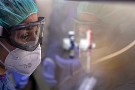 Az új koronavírussal fertőzött betegeket ápoló nõvér a madridi Ramon y Cajal kórház intenzív osztályán 2020. április 24-én