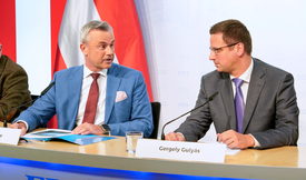 Gulyás Gergely Miniszterelnökséget vezetõ miniszter (j) és Norbert Hofer, az Osztrák Szabadságpárt (FPÖ) burgenlandi csúcsjelöltje (b) a megbeszélésük után tartott sajtótájékoztató Bécsben 2025. január 15-én.
