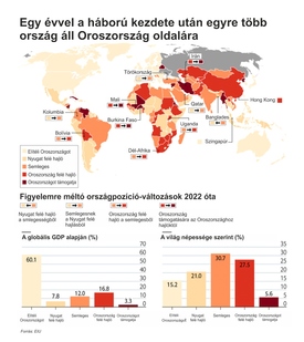 Az elmúlt évben az Oroszországot aktívan elítélő országok száma 131-ről 122-re csökkent, mivel néhány feltörekvő gazdaság semleges álláspontra tért át. Az USA és az EU vezette blokk, amely a világ népességének mintegy 36 százalékát képviseli, erős együttműködést tanúsított a szankciókkal kapcsolatban, valamint szilárd katonai és gazdasági támogatást nyújtott Ukrajnának.