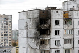 Orosz dróntámadásban találatot kapott kijevi lakótömb 2024. november 2-án.
