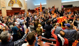 A feszült helyzet csütörtökön csúcsosodott ki, amikor a képviselőház napirendjén kívül a választások második helyén végző szociáldemokraták, valamint az albán kisebbségi pártok egy albán nemzetiségű képviselőt választottak meg a parlament új elnökének. A jobboldali tiltakozók ezt követően törtek be az ülésterembe, és székekkel, valamint minden kezük ügyébe kerülő tárgyal kezdték el megdobálni és ütni a bent tartózkodókat. A támadás egyik sérültje a szociáldemokraták vezetője, Zoran Zaev volt.