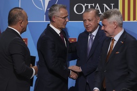 Mevlüt Cavusoglu török külügyminiszter, Jens Stoltenberg NATO-főtitkár és Recep Tayyip Erdogan török (b-j) Madridban 2022. június 28-án, miután Törökország beleegyezett Svédország és Finnország NATO-tagságának támogatásába