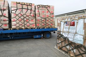 A török védelmi minisztérium felvételén egészségügyi segélyszállítmányt rakodnak be a török légierő egyik szállítógépébe, amely az Egyesült Államokba indul az Ankara közelében lévõ etimesguti katonai repülõtérről 2020. április 30-án, a koronavírus-járvány idején.