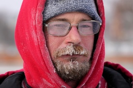 Jég és hó van Mark Sorter arcára fagyva, miközben havat takarít le egy városi jégpályáról az Iowa állambeli Des Moines-ban 2022. december 23-án.