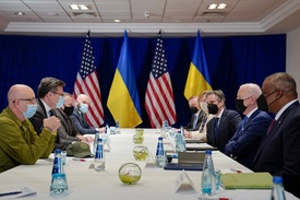 Joe Biden amerikai elnök (j2), Antony Blinken amerikai külügyminiszter (j3) és Lloyd Austin amerikai védelmi miniszter (j) Dmitro Kuleba ukrán külügyminiszterrel (b2) és Olekszij Reznyikov ukrán védelmi miniszterrel (b) tárgyal Varsóban 2022. március 26-án