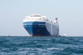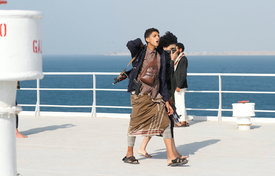 Jemeni húszi fegyveresek egy elfoglalt teherhajón, a Galaxy Leaderen