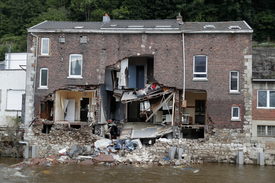 A heves esõzések nyomán kialakult özönvízszerû áradások miatt megrongálódott ház a belgiumi Pepinsterben 2021. július 19-én.