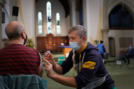 Nick Gray egészségügyi dolgozó beadja az AstraZeneca svéd-brit gyógyszergyártó koronavírus elleni oltóanyagát egy páciensnek a londoni Ealing negyed St. John-templomában kialakított oltóközpontban 2021. március 16-án.