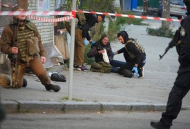 Elsősegélyben részesítenek dróntámadás után egy járókelőt Kijevben 2022. október 17-én. MTI/AP/Efrem Lukackij