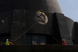 A sarlót és kalapácsot néhány napja szerelték le munkások az emlékműről, amelyet 1981-ben avatott fel Leonyid Brezsnyev egykori szovjet pártfőtitkár.