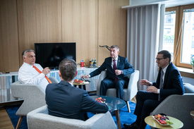 A Miniszterelnöki Sajtóiroda által közreadott képen Orbán Viktor magyar, Eduard Heger szlovák (háttal), Andrej Babis cseh és Mateusz Morawiecki lengyel miniszterelnök (b-j) a visegrádi országok (V4) kormányfõinek egyeztetésén a brüsszeli EU-csúcs elõtt 2021. június 24-én.