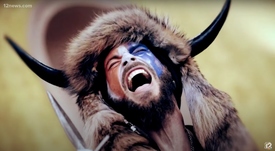 Chansley szarvakkal ékesített medvebőr fejdíszével, vörös, fehér és kék arcfestékkel bemázolt arccal, csupasz felsőtettel, amerikai zászlóval felszerelt lándzsával pózolt a tömegben. Az összeeskövés-elméleteket terjesztő, szélsőséges QAnon mozgalom tagját jogtalan behatolással és rendzavarással vádolják.