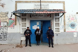 Rendőrök őrt állnak egy tuniszi szavazóhelyiség előtt a parlamenti választások második fordulójának napján, 2023. január 29-én.