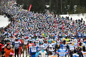 Versenyzõk rajtolnak a 100. alkalommal megrendezett Vasaloppet elnevezésû, klasszikus stílusú sífutóversenyen a svédországi Sälenben 2024. március 3-án.