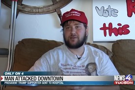 Jonathan Sparks az arizonai Tucson belvárosában sétált, amikor Trump-sapkája miatt egy férfi megtámadta.Jonathan Sparks az arizonai Tucson belvárosában sétált, amikor Trump-sapkája miatt egy férfi megtámadta. Sparks bokája eltört.