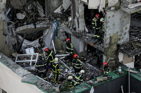 A mentõalakulat tagjai a legutóbbi orosz légitámadásban súlyosan megrongálódott lakóházak egyikében 2023. június 24-én.