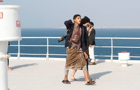Fegyveresek az Irán által támogatott jemeni húszi lázadók által elfoglalt Galaxy Leader teherhajón, amely a Vörös-tengeren vesztegel a nyugat-jemeni Hodeida asz-Szalif kikötõje közelében 2023. december 5-én.
