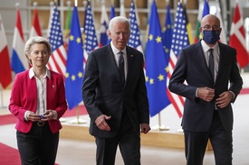 Charles Michel, az Európai Tanács és Ursula von der Leyen, az Európai Bizottság elnöke fogadja Joe Biden amerikai elnököt az Európai Unió-Egyesült Államok csúcstalálkozón Brüsszelben 2021. június 15-én