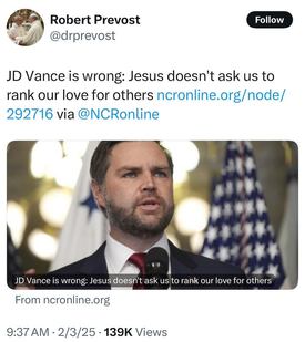 Ferenc pápához hasonlóan ugyanis az új egyházfő is szembehelyezkedik Donald Trump migrációs politikájával. Bíborosként kritikusan viszonyult J. D. Vance alelnök kijelentéséhez is, aki egy interjúban úgy fogalmazott: „Van egy keresztény nézőpont, amely szerint először a családodat szereted, majd a felebarátodat, a közösségedet, az állampolgártársaidat, és csak ezt követően a világ többi részét.” Válaszul az akkor még bíboros Robert Prevost 2025 februárjában X-oldalán megosztotta a National Catholic Reporter egyik cikkét „J. D. Vance téved: Jézus nem kéri tőlünk, hogy rangsoroljuk a mások iránti szeretetünket” címmel.