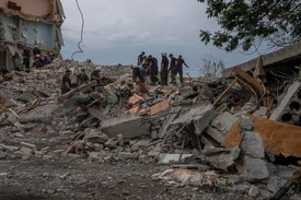 Orosz rakétatámadásban megrongálódott lakóház a Donyeck megyei Csasziv Jar településen 2022.július 10-én. Az ötszintes épületben legkevesebb 15 ember életét vesztette és sokan megsebesültek. MTI/AP